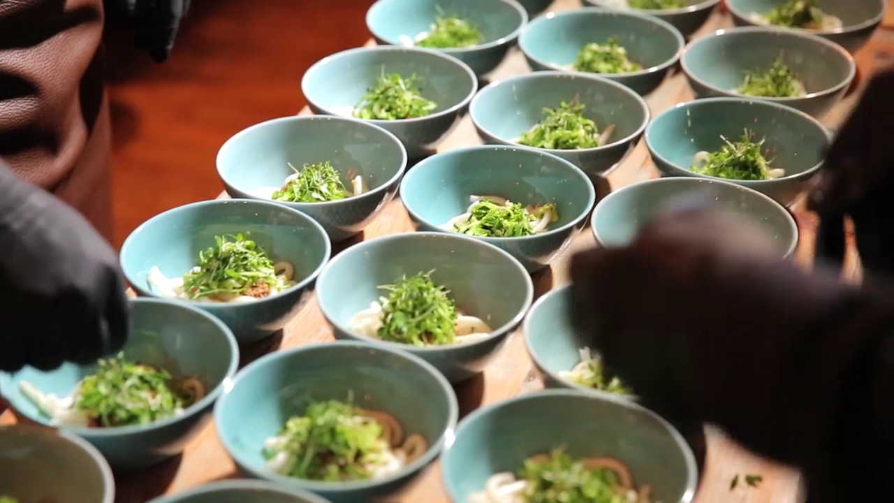 Eine Überraschung war die anschließende Bloody-Mary-Variation mit dem Sellerie-Gin von Rutte, Sauerkraut-Essenz, Tomatensaft, Vanille und Sojasauce, die in einer Take-Away Box mit Glückskeks serviert wurde. Dazu schickte die Küche eine Sauerkraut-Udon-Brühe mit Kohl, Eigelb und Kassler auf die kleinen Bartische. Und während der Drink vor dem Essen der Brühe noch vorrangig nach Tomate geschmeckt hatte, traten in Kombination mit dem Food nun die Sellerienote des Gins angenehm in den Vordergrund. Darüber hinaus traf Fenchel-Wodka auf Räucheraal, Genever auf Rind mit fermentiertem Knoblauch und Bourbon auf Karotte, Ingwer und Sanddorn.